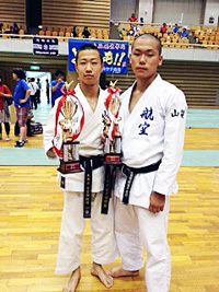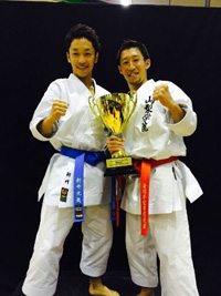 | 佐藤隼将(右側) 山梨学院高校→山梨学院大学4年 下吉田中学校出身 ◎糸東会全国大会少年男子形3位 ◎関東糸東会少年男子形優勝 ◎オークランドオープンシニア形優勝 ◎カラオケ大会最優秀賞 ◎ |